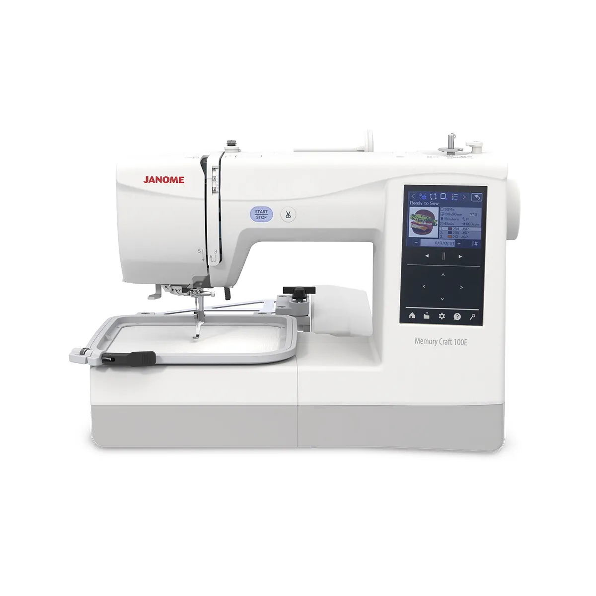 Nueva Bordadora Janome MC100E, ideal para iniciarte en el bordado y personalizacion. Ofrece un area de bordado generosa de 140x140mm con la que podrás bordar nombres y dibujos.