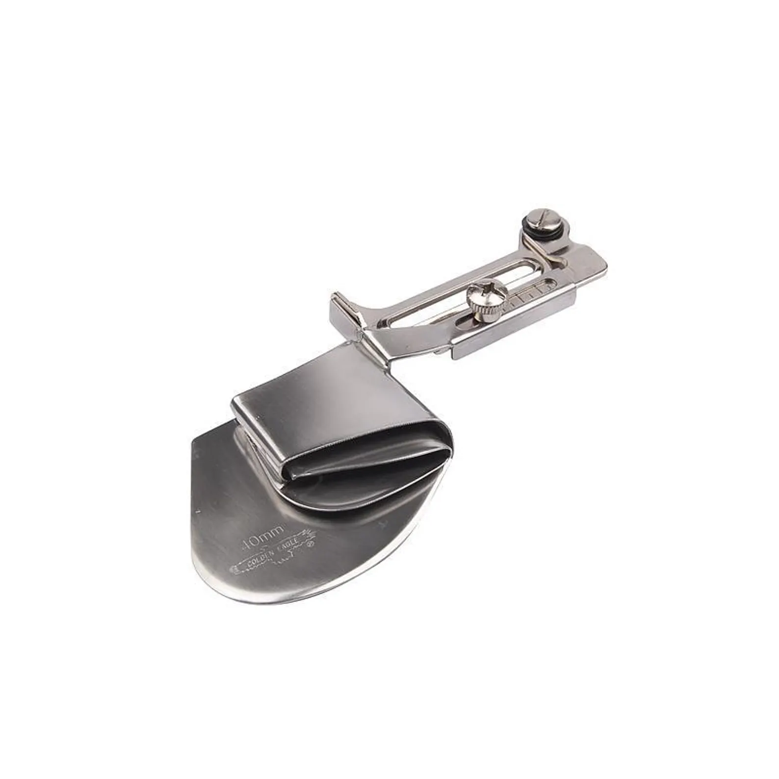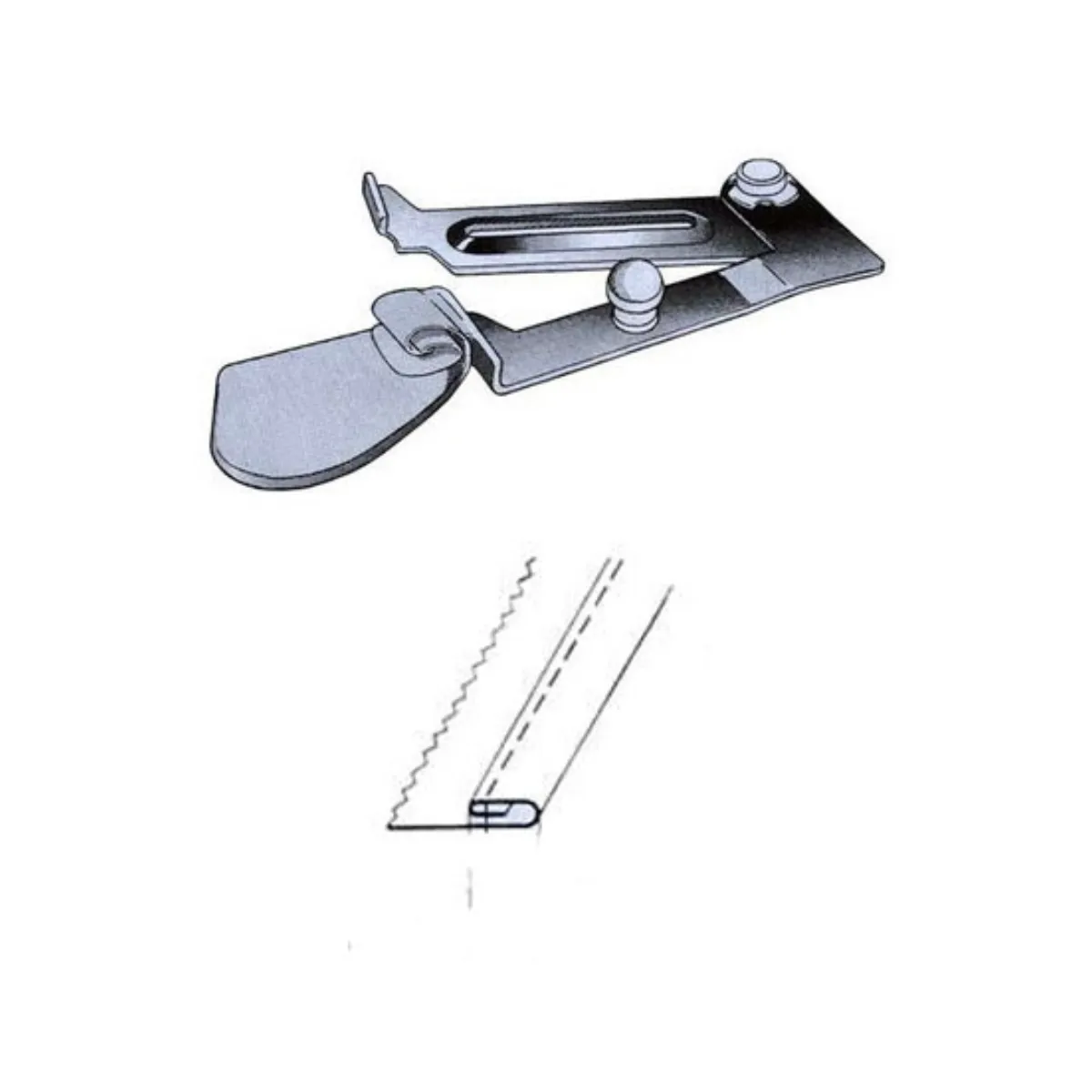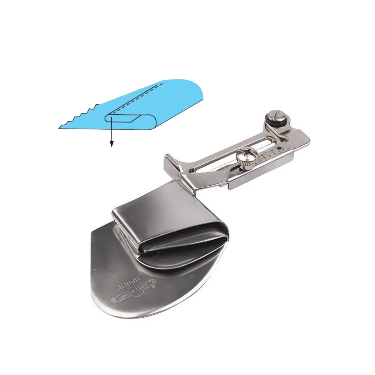 Embudo dobladillador con soporte abatible Modelo A11. Se adapta a todas las máquinas de coser industriales planas.