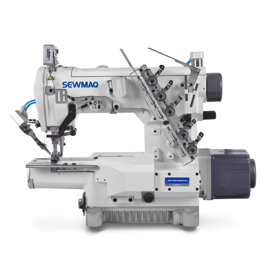 Máquina recubridora de base cilindrica de 3 agujas con recubrimiento superior e inferior, equipada con motor servo en el cabezal, cortahilos superior e inferior electrico y alzaprensatelas electrico.