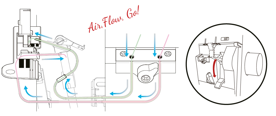 Enhebrado por Aire (Air Threading): El sistema estrella que utiliza un chorro de aire para pasar automáticamente los hilos por los garfios inferiores y superiores, haciendo el enhebrado casi instantáneo.