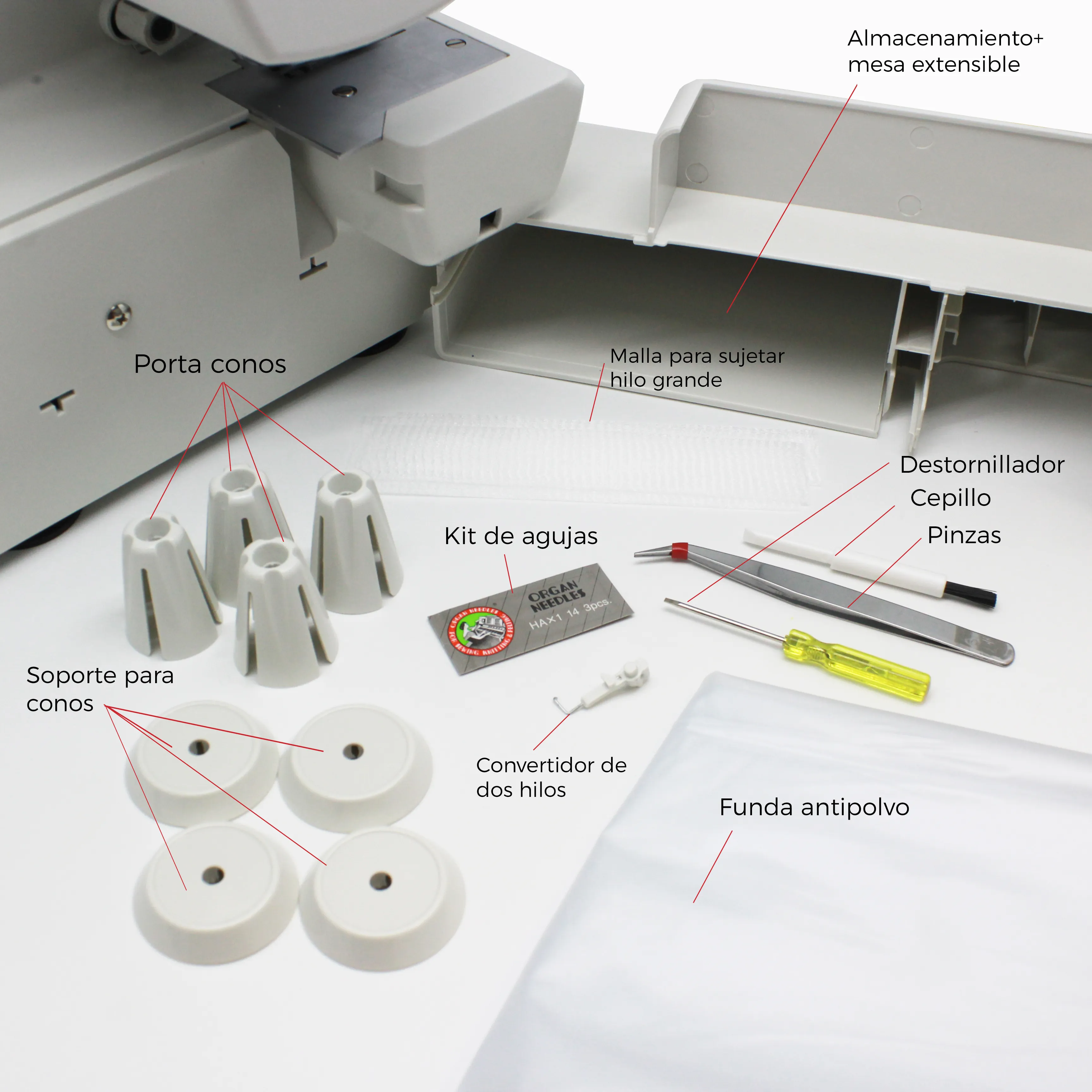 Diseñada para que cualquier usuario pueda aprovecharla desde el primer momento, dispone de sistema de enhebrado con códigos de color, guías visibles y se entrega semi-enhebrada de fábrica, lista para coser en pocos minutos. La iluminación LED, la caja de accesorios integrada y su completo equipamiento hacen de ella una máquina práctica y preparada para cualquier desafío.