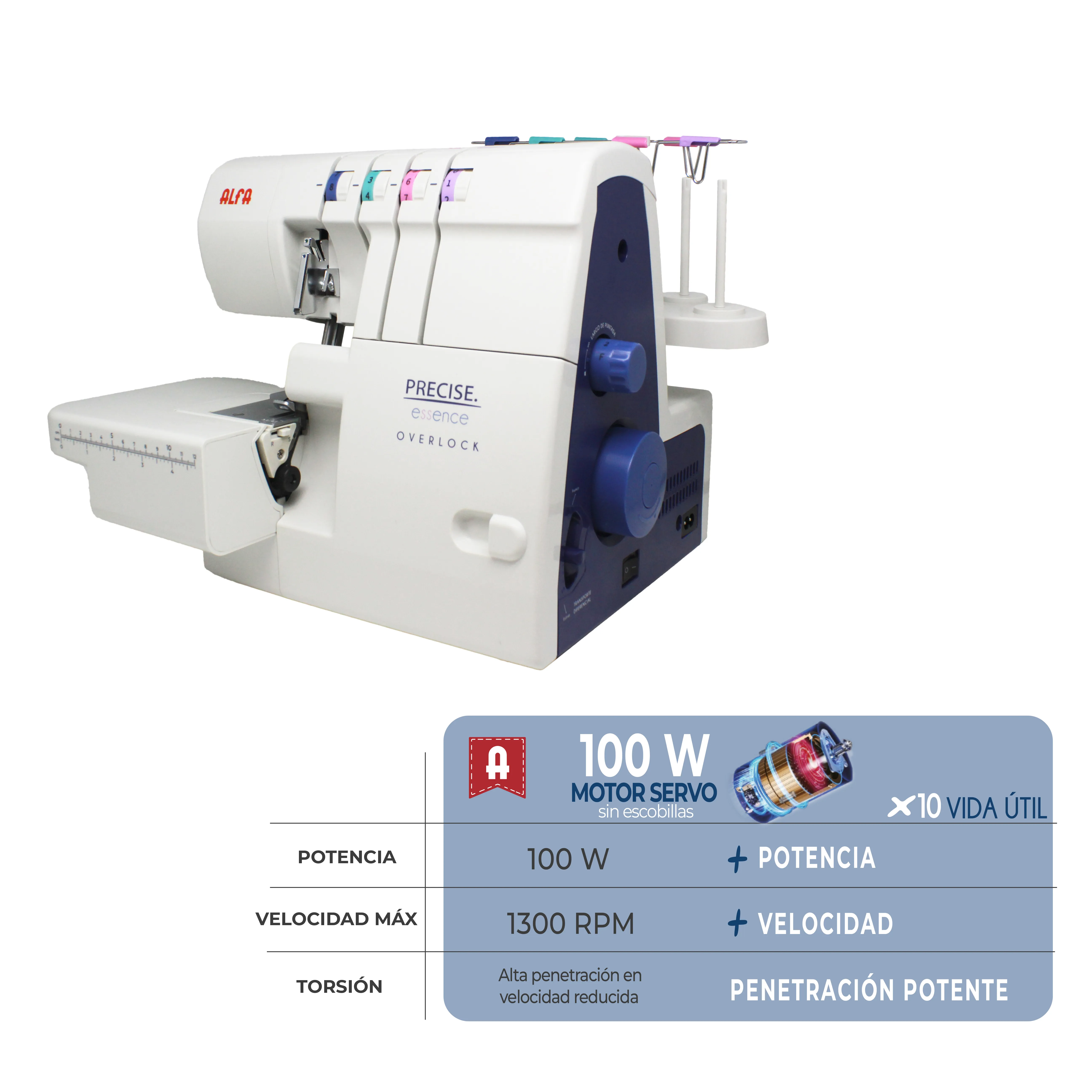 Con la remalladora Alfa PRECISE Essence podrás lograr acabados de nivel profesional desde casa. Incorpora un motor Servo brushless de 100 W, sin escobillas, capaz de alcanzar hasta 1.300 puntadas por minuto, ofreciendo una costura precisa y una excelente fuerza de penetración incluso a velocidades bajas. Trabaja con 2, 3 o 4 hilos y cuenta con cuchilla abatible, brazo libre y mesa extensible, adaptándose sin esfuerzo a todo tipo de proyectos.